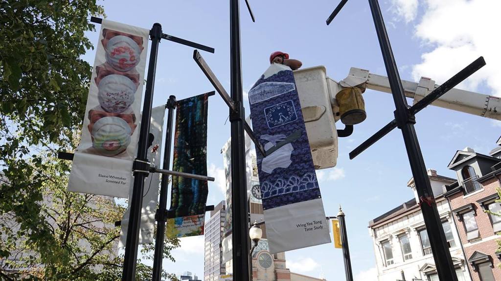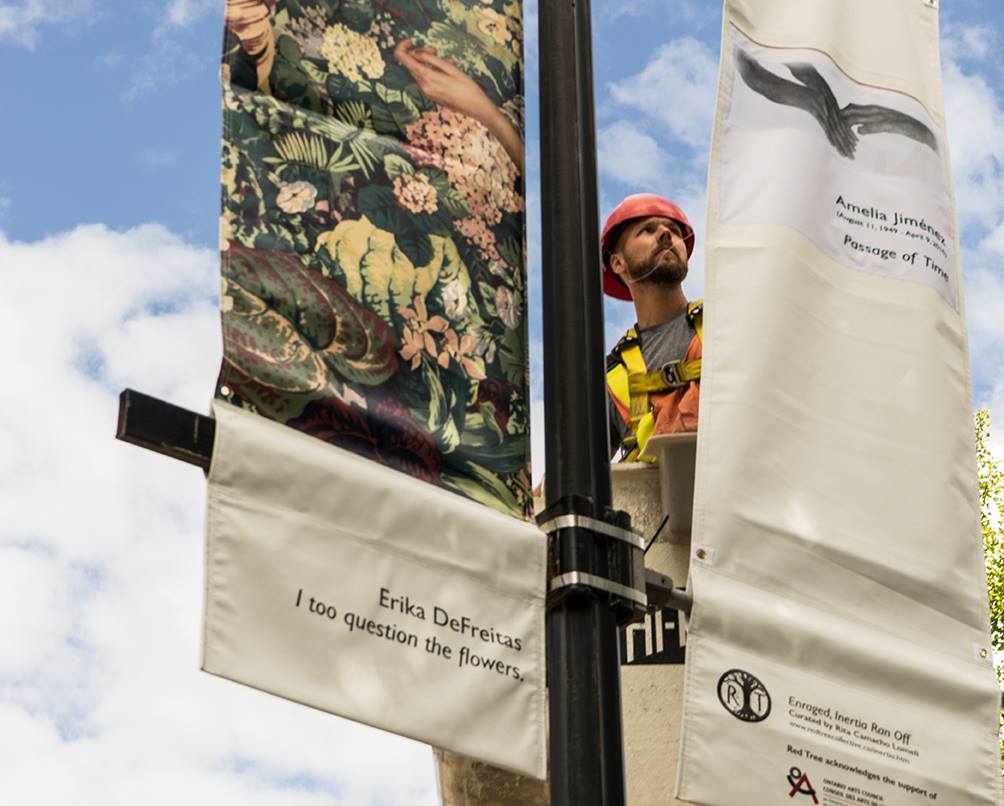 The corner of Wilson Street and James Street North – the “Entrance to the Arts District” – is a site that highlights some of the tensions between downtown Hamilton’s past, present and future. Five double-banner stands were erected in the 1980s, abandoned in the ’90s and re-claimed by the arts in 2015 to celebrate Hamilton as the host of the Juno Awards. ENRAGED, INERTIA RAN OFF is a contemporary art intervention by the Red Tree Artists’ Collective, signaling transformation of not only the site, but also of traditional skills employed by women in a post-industrial society, stitching together the divide between traditional craft and fine art. Automatized machinery now performs activities that women used to do in the privacy of the domestic sphere – stitching, embroidering, sewing, knitting – but here they are displayed in a public space.