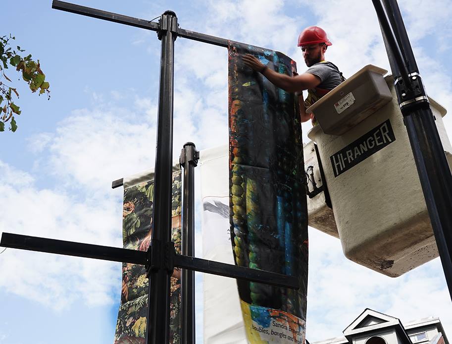 10 women artists intervene with abandoned signposts at the corner of James Street North and Wilson Street in Hamilton.